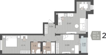 Продаётся 2-комнатная квартира в строящемся доме (Дом 3 (1 этап)), срок сдачи: IV-кв. 2028, общей площадью 66.78 кв.м., на 5 этаже.