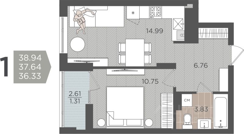 Продаётся 1-комнатная квартира в строящемся доме (Дом 3 (1 этап)), срок сдачи: IV-кв. 2028, общей площадью 37.64 кв.м., на 9 этаже.