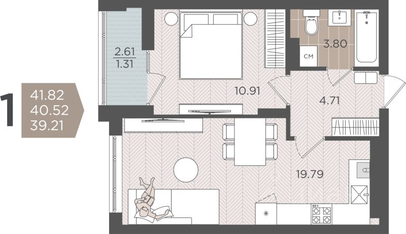 Продаётся 1-комнатная квартира в строящемся доме (Дом 3 (1 этап)), срок сдачи: IV-кв. 2028, общей площадью 40.52 кв.м., на 8 этаже.