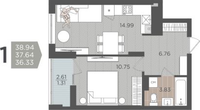 Продаётся 1-комнатная квартира в строящемся доме (Дом 3 (1 этап)), срок сдачи: IV-кв. 2028, общей площадью 37.64 кв.м., на 8 этаже.