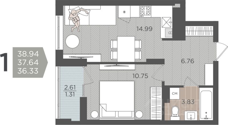Продаётся 1-комнатная квартира в строящемся доме (Дом 3 (1 этап)), срок сдачи: IV-кв. 2028, общей площадью 37.64 кв.м., на 5 этаже.