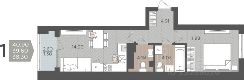 Продаётся 1-комнатная квартира в строящемся доме (Дом 3 (1 этап)), срок сдачи: IV-кв. 2028, общей площадью 39.6 кв.м., на 1 этаже.