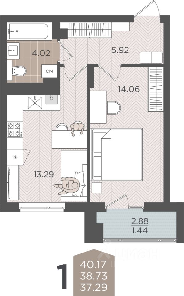 Продаётся 1-комнатная квартира в строящемся доме (Дом 3 (2 этап)), срок сдачи: IV-кв. 2028, общей площадью 38.73 кв.м., на 8 этаже.
