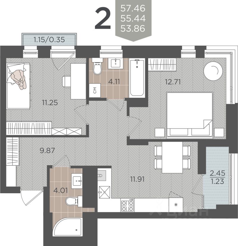 Продаётся 2-комнатная квартира в строящемся доме (Дом 3 (2 этап)), срок сдачи: IV-кв. 2028, общей площадью 55.44 кв.м., на 8 этаже.