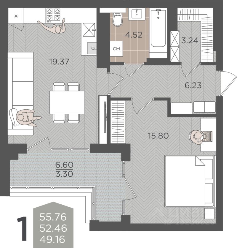 Продаётся 1-комнатная квартира в строящемся доме (Дом 3 (2 этап)), срок сдачи: IV-кв. 2028, общей площадью 52.46 кв.м., на 3 этаже.
