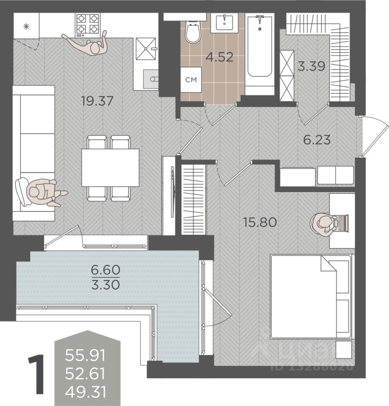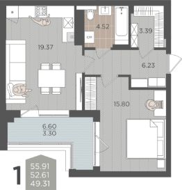 Продаётся 1-комнатная квартира в строящемся доме (Дом 3 (2 этап)), срок сдачи: IV-кв. 2028, общей площадью 52.61 кв.м., на 2 этаже.