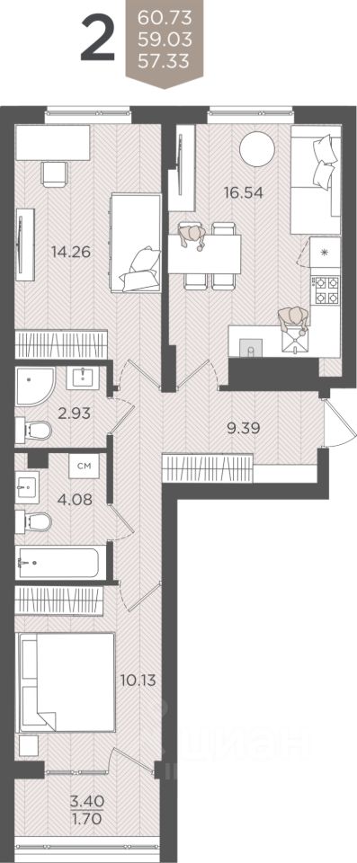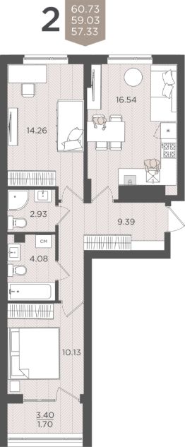Продаётся 2-комнатная квартира в строящемся доме (Дом 3 (2 этап)), срок сдачи: IV-кв. 2028, общей площадью 59.03 кв.м., на 1 этаже.