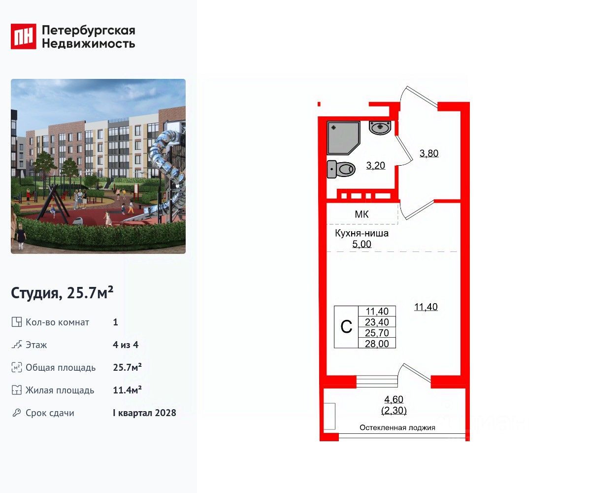 Удобная, классическая, функциональная европланировка, большая кухня-гостиная 5 м², просторная прихожая 3.8 м². Общая площадь студии - 25.7 м², жилая 11.4 м², высота потолка 3 м.