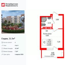 Удобная, классическая, функциональная европланировка, большая кухня-гостиная 5 м², просторная прихожая 3.9 м². Общая площадь студии - 21.5 м², жилая 7.2 м², высота потолка 3 м.