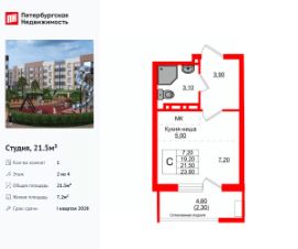 Удобная, классическая, функциональная европланировка, большая кухня-гостиная 5 м², просторная прихожая 3.9 м². Общая площадь студии - 21.5 м², жилая 7.2 м², высота потолка 2.7 м.
