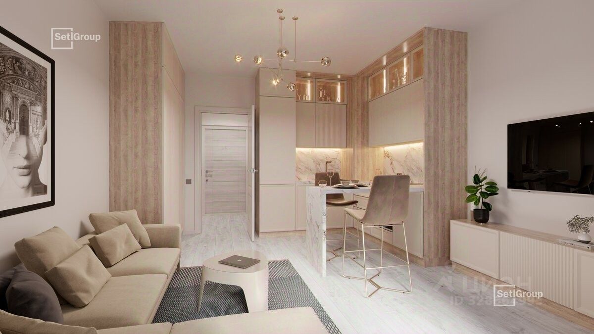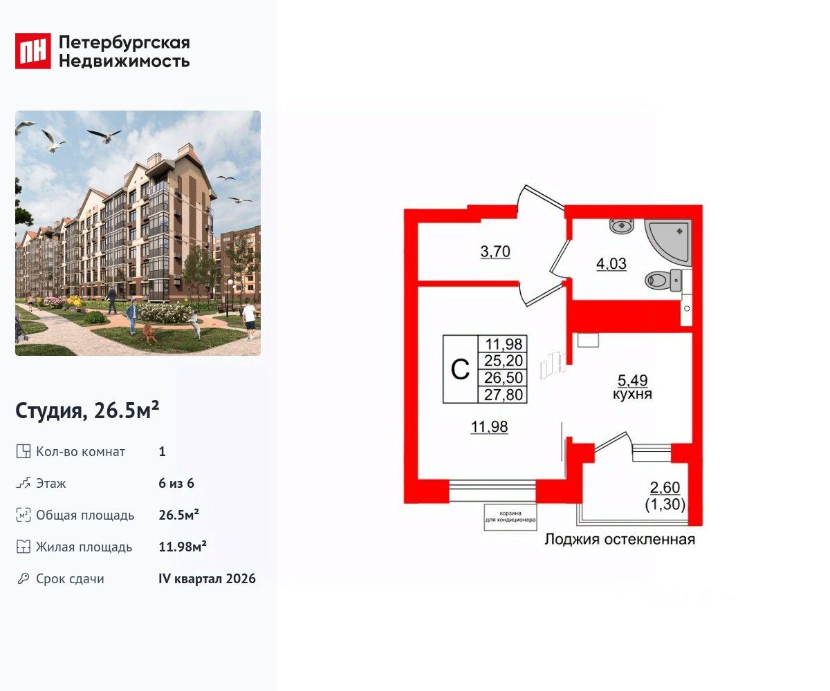 Удобная, классическая, функциональная европланировка, большая кухня-гостиная 5.49 м², просторная прихожая 3.7 м². Общая площадь студии - 26.5 м², жилая 11.98 м², высота потолка 3.3 м.