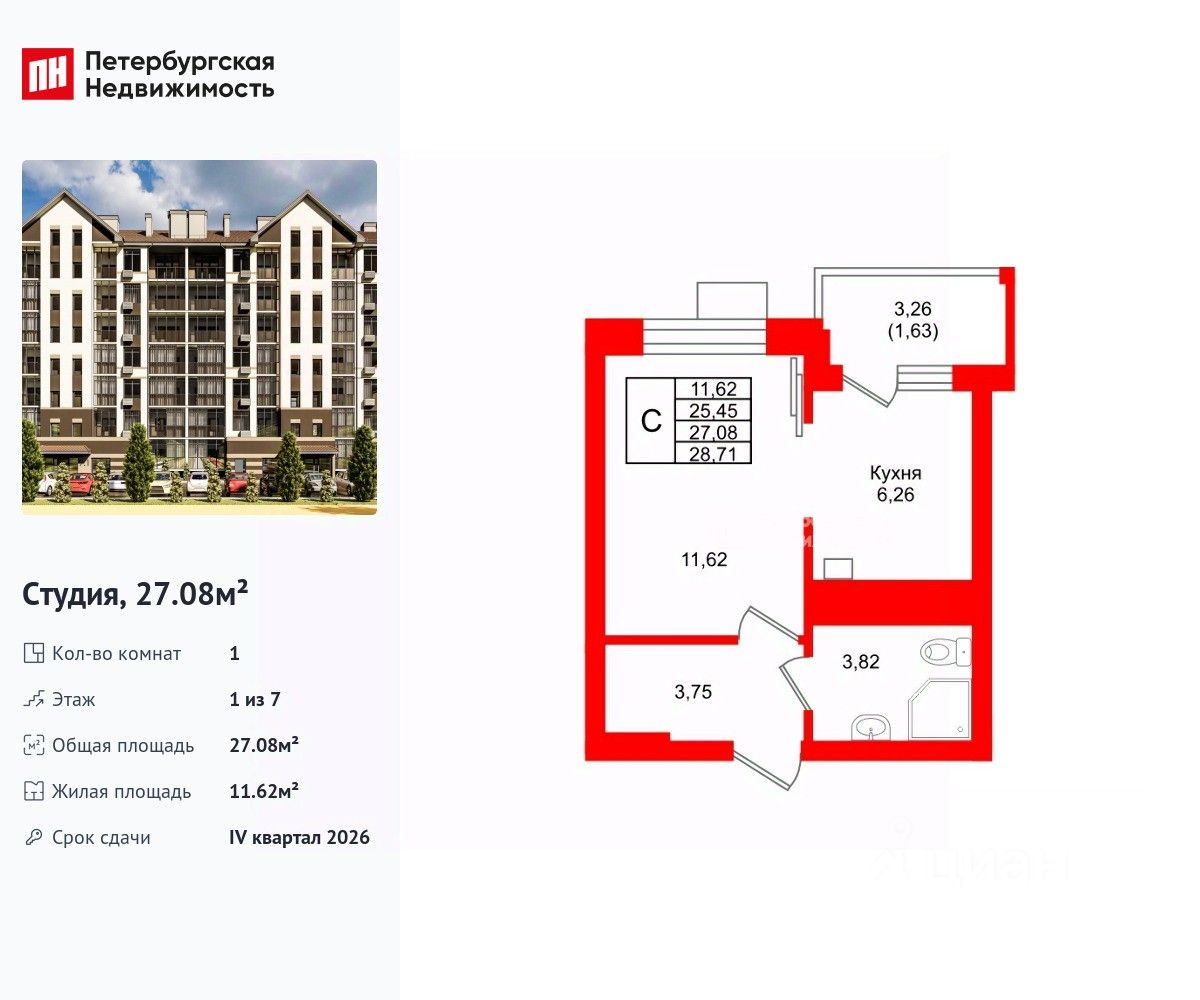 Удобная, классическая, функциональная европланировка, большая кухня-гостиная 6.26 м², просторная прихожая 3.75 м². Общая площадь студии - 27.08 м², жилая 11.62 м², высота потолка 3 м.