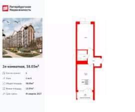 Удобная, классическая, функциональная европланировка, большая кухня-гостиная 14.15 м², просторная прихожая 4.57 м². Общая площадь квартиры - 38.03 м², жилая 13.97 м², высота потолка 3 м.
