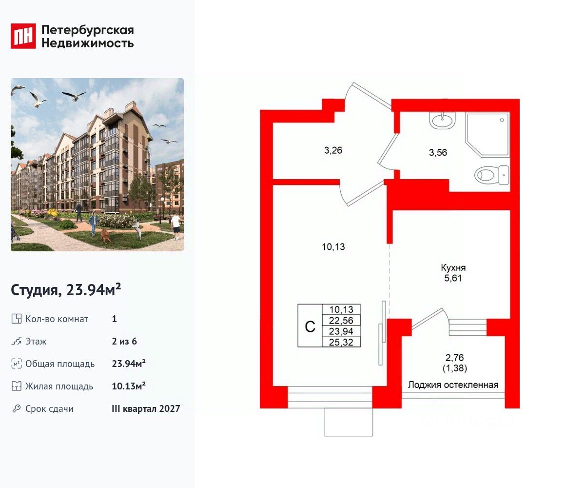 Удобная, классическая, функциональная европланировка, большая кухня-гостиная 5.61 м², просторная прихожая 3.26 м². Общая площадь студии - 23.94 м², жилая 10.13 м², высота потолка 3 м.