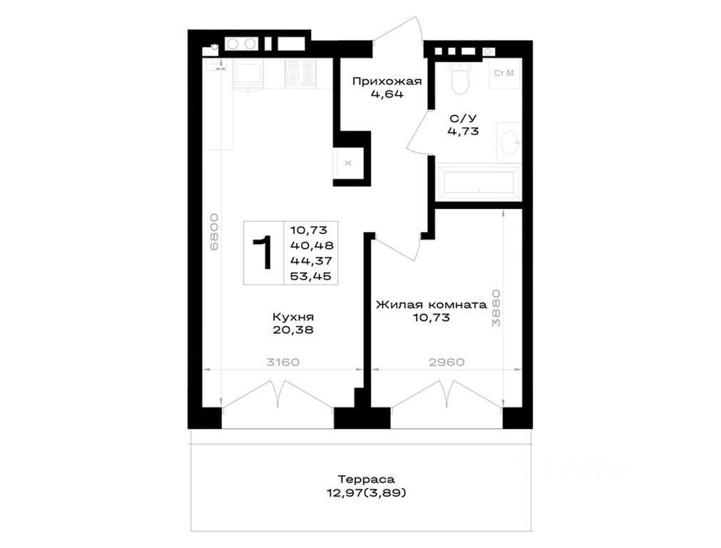 Общая площадь44,37 м²