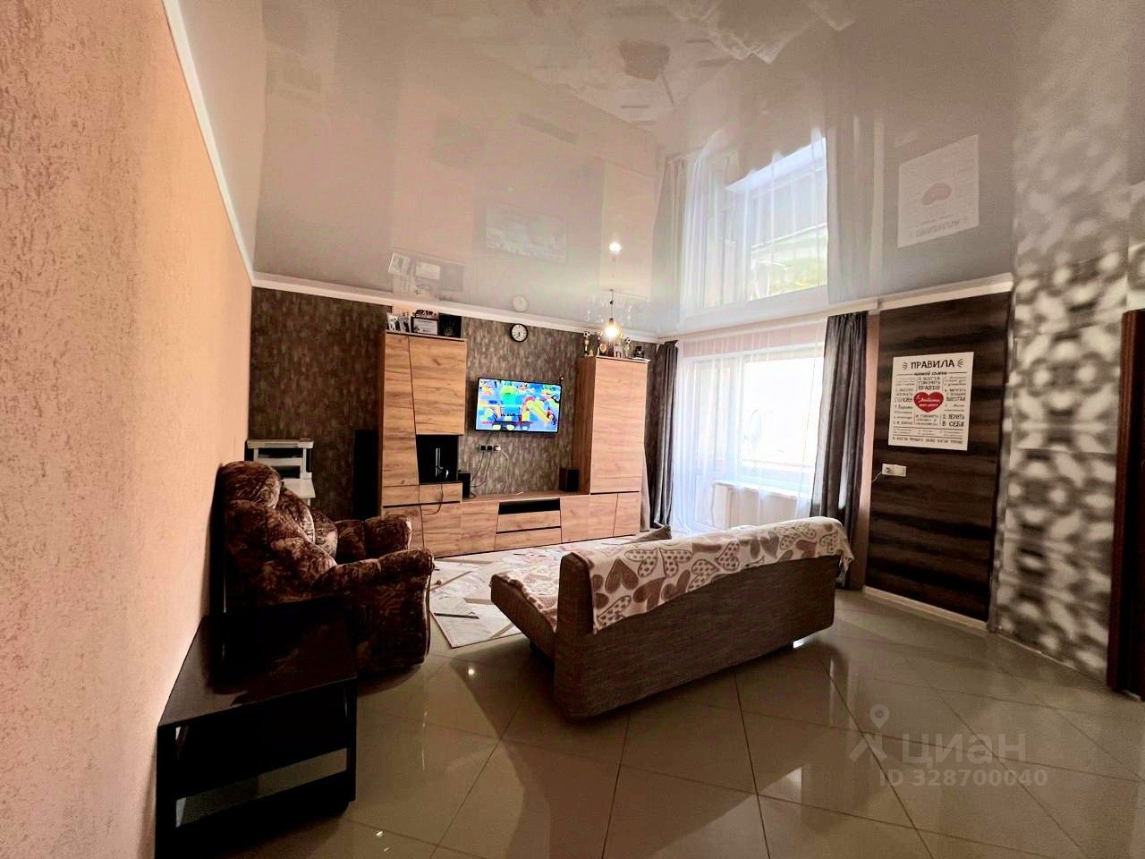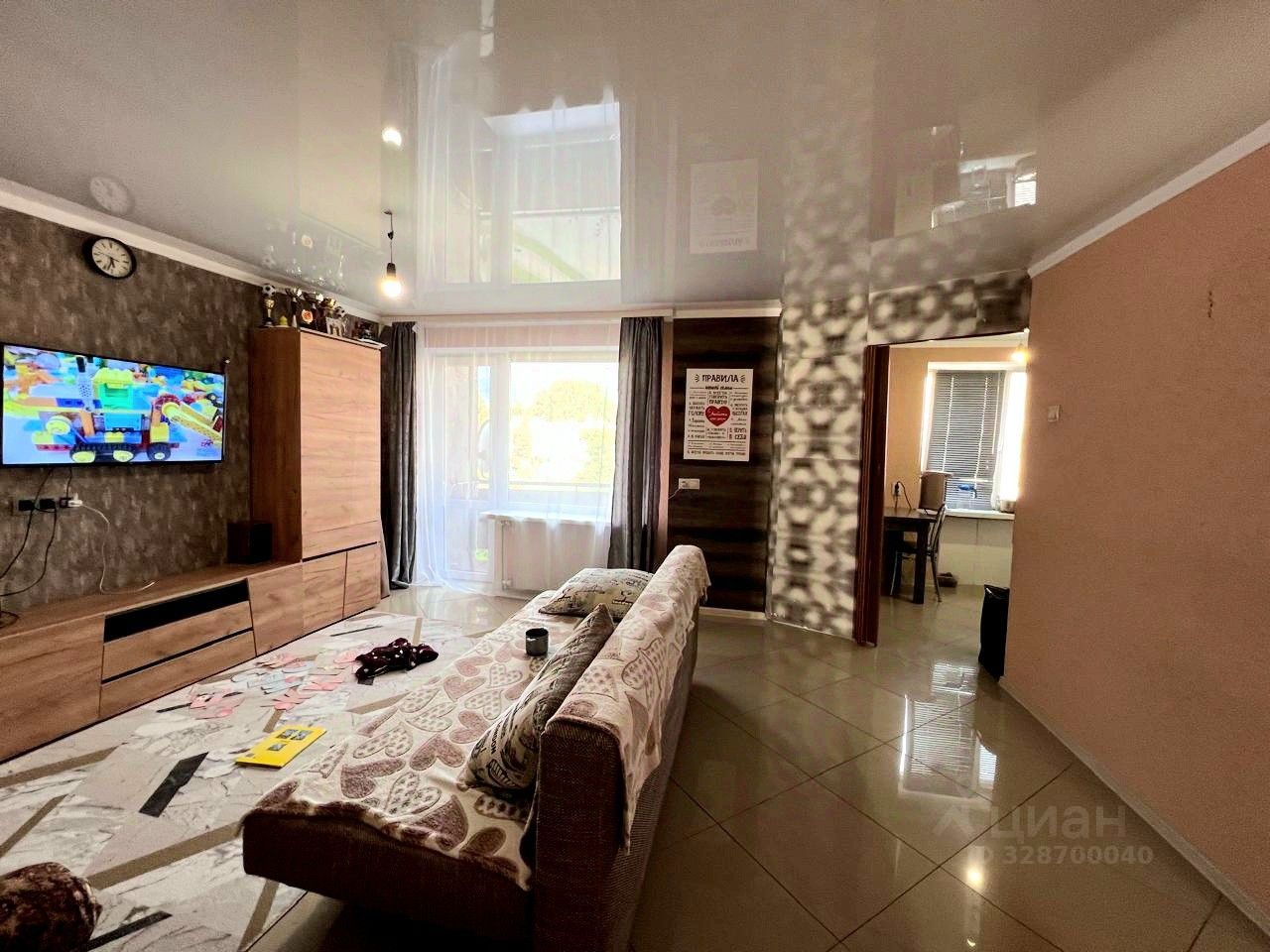 Плитка в гостиной и кухне.