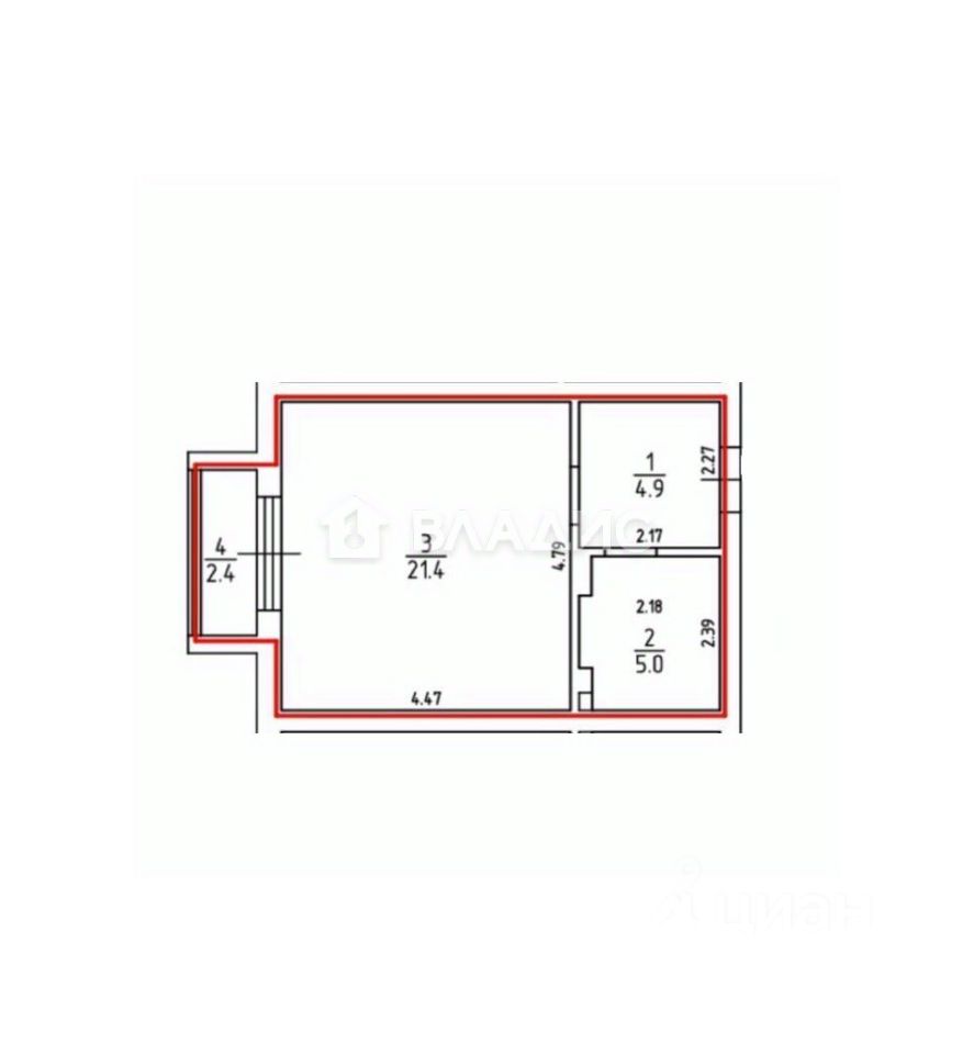 Площадь комнаты - 21.4 кв.м