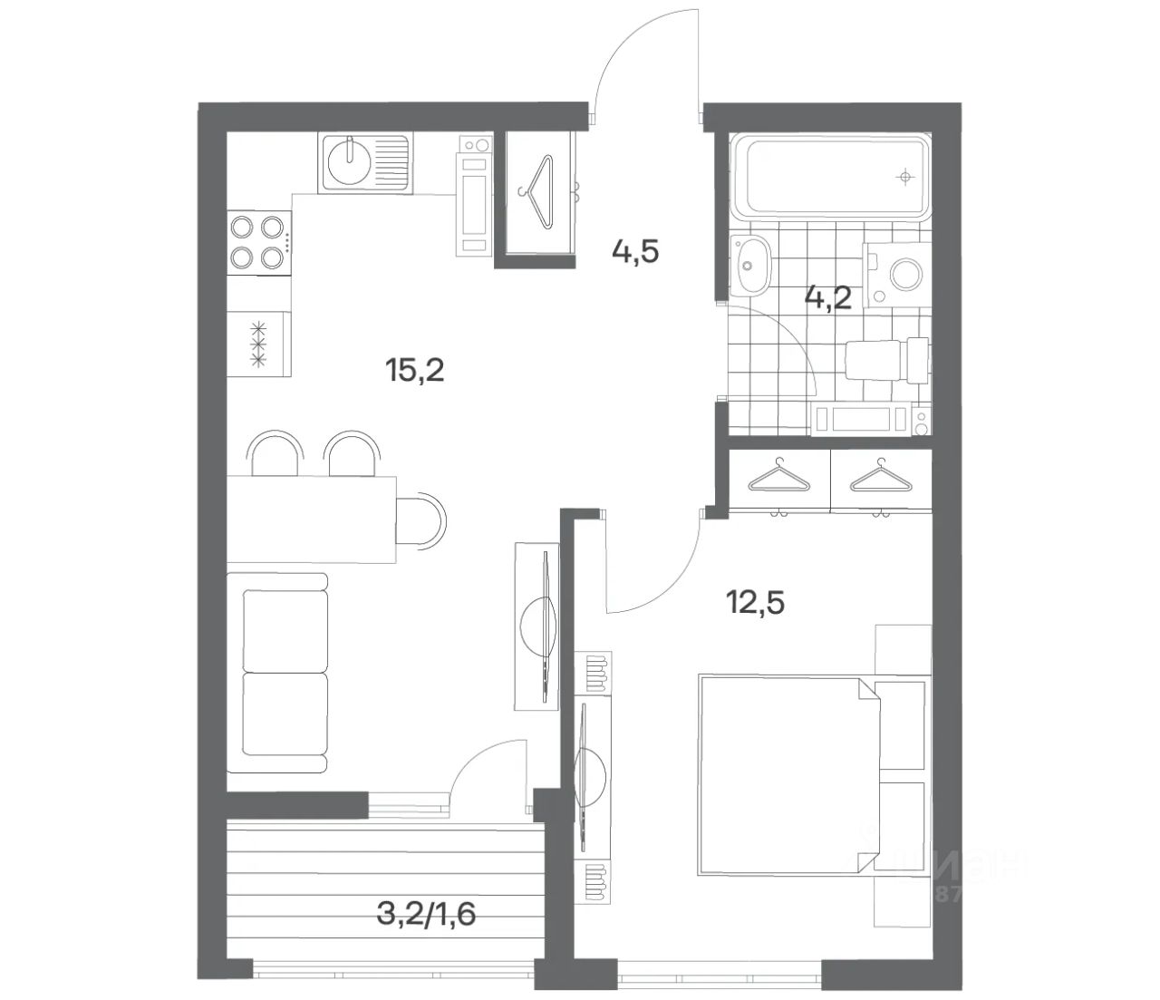 в Гагарина 30 от компании ГК "ТРЕСТ". Площадь кухни 15.2 м². Жилой комплекс комфорт-класса "Гагарина 30" расположен в Ленинградском районе Калининграда на улице Юрия Гагарина. Жилой комплекс включает в себя три корпуса высотой 9-18 этажей. Срок сдачи намечен на 1 квартал 2028 года.