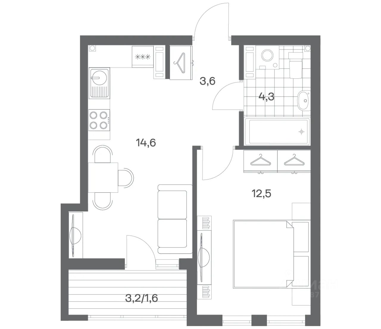 в Гагарина 30 от компании ГК "ТРЕСТ". Площадь кухни 14.6 м². Жилой комплекс комфорт-класса "Гагарина 30" расположен в Ленинградском районе Калининграда на улице Юрия Гагарина. Жилой комплекс включает в себя три корпуса высотой 9-18 этажей. Срок сдачи намечен на 1 квартал 2028 года.
