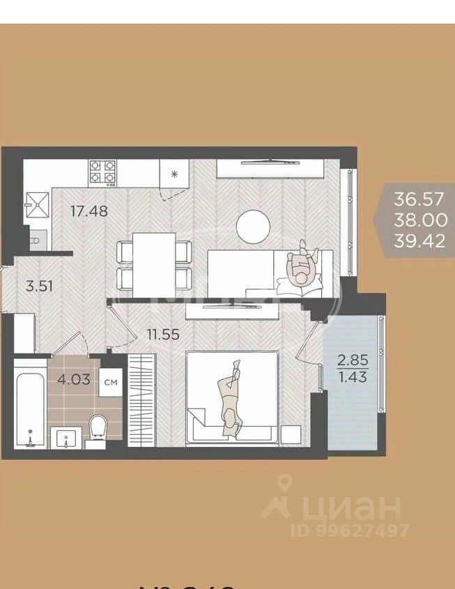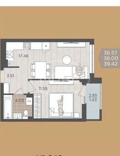 Общая площадь квартиры с холодными помещениями 39,4 кв.м., Жилая площадь 11,6 кв.м., Кухня-гостиная 17,5 кв.м., Совмещенный санузел