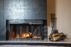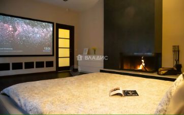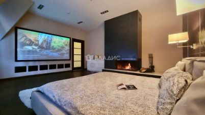 • дизайнерский дровяной камин и проектор Epson с экраном в спальне,