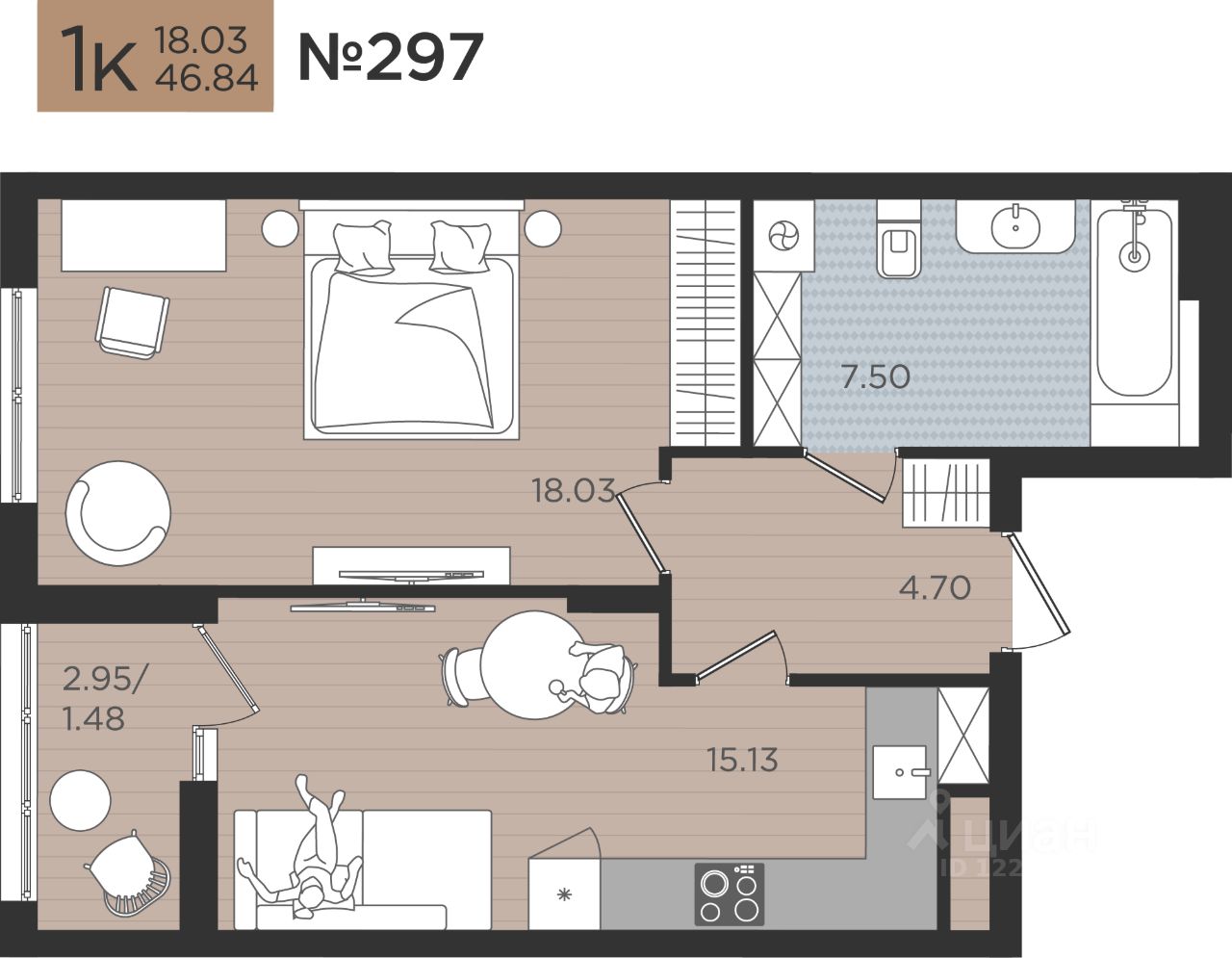 Продаётся комфортабельная 1-комнатная квартира 297 на Советском проспекте, 50 в ЖК "МОЙ ГОРОД"