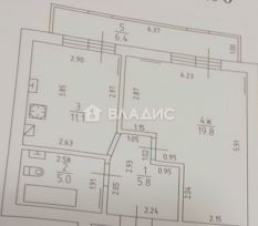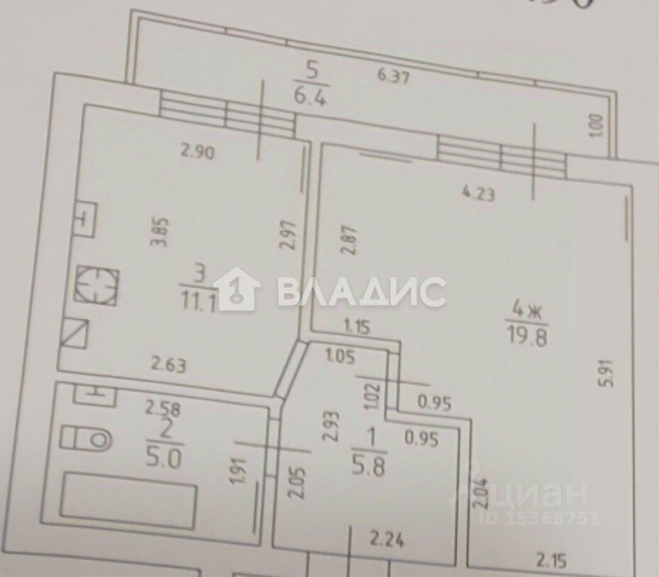 Общая площадь квартиры составляет 48,1 кв. м, жилая — 19.8 кв. м, площадь кухни — 11,1 кв. м