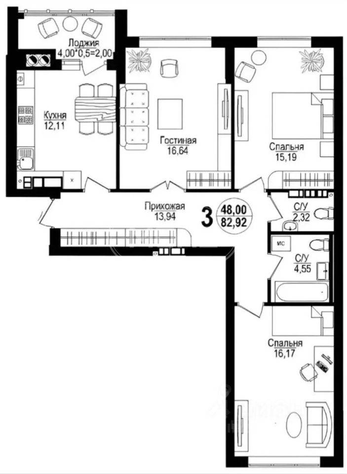 • Просторная гостинная 16 м.кв. Две спальни по 15 и 16 м