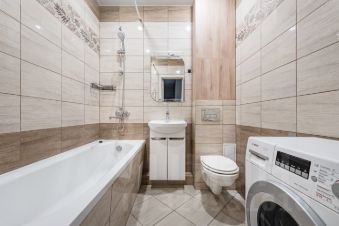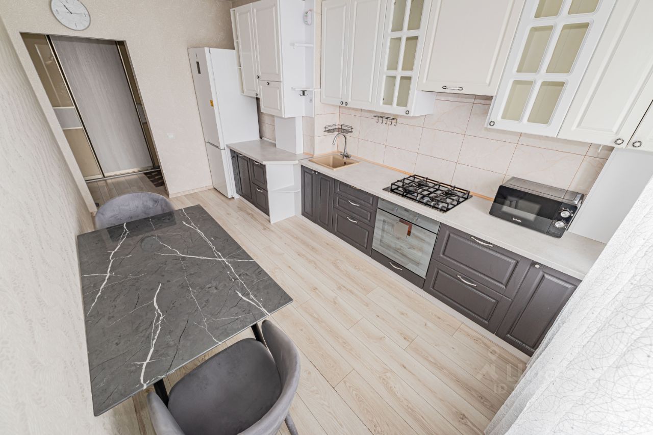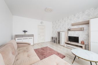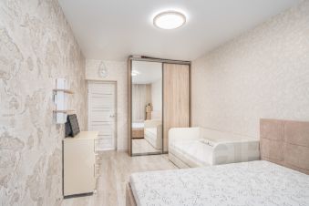 Есть всё необходимое: двуспальная кровать, диван, шкафы-купе, комоды, тумбы, полочки, кухонный комплект, стол, стулья, посудомоечная машина, микроволновая печь, варочная поверхность, духовка, полностью оборудованный эстетичный санузел со стиральной машиной.