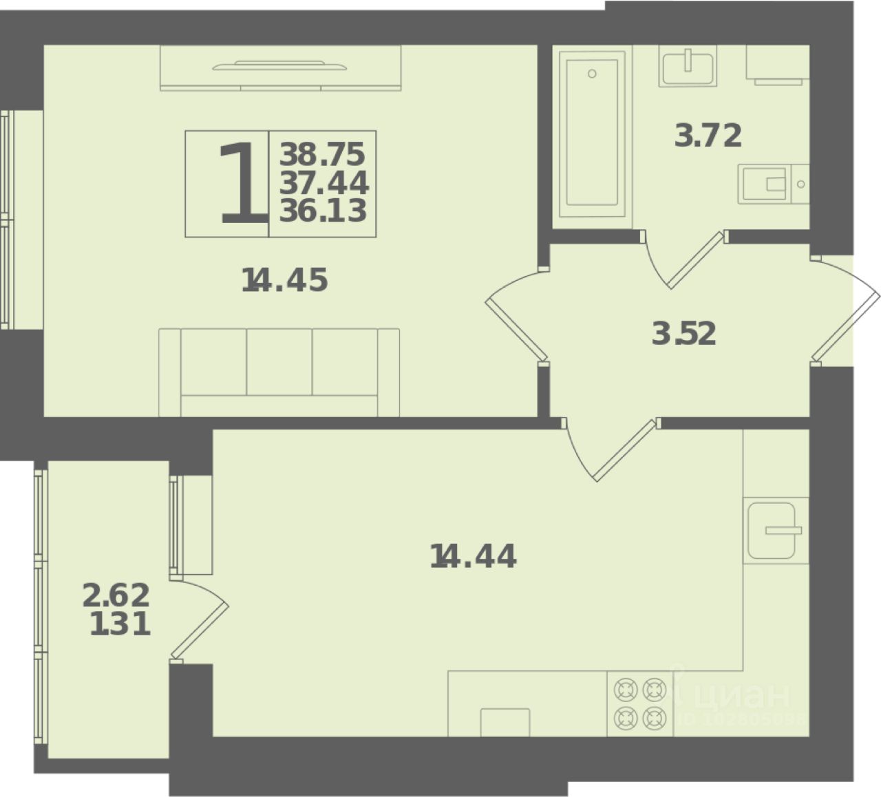 Общая площадь38,75 м²