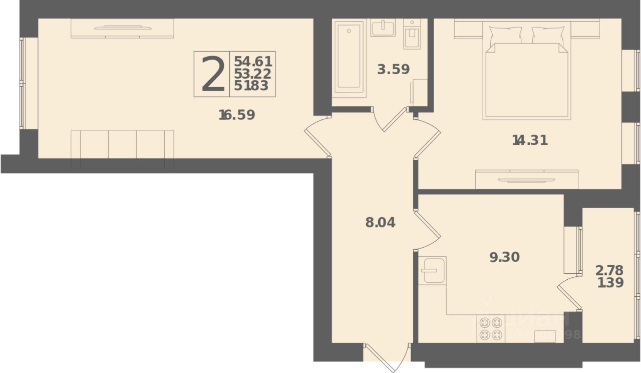 Общая площадь54,61 м²