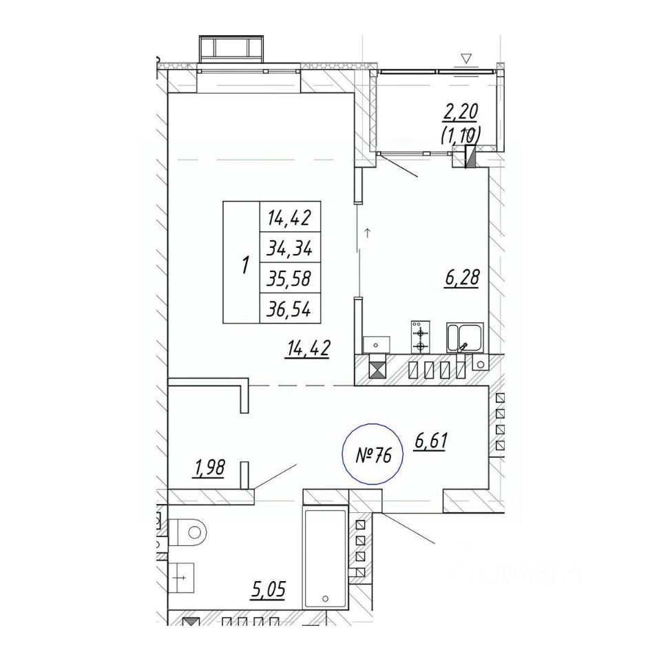 Общая площадь35,44 м²