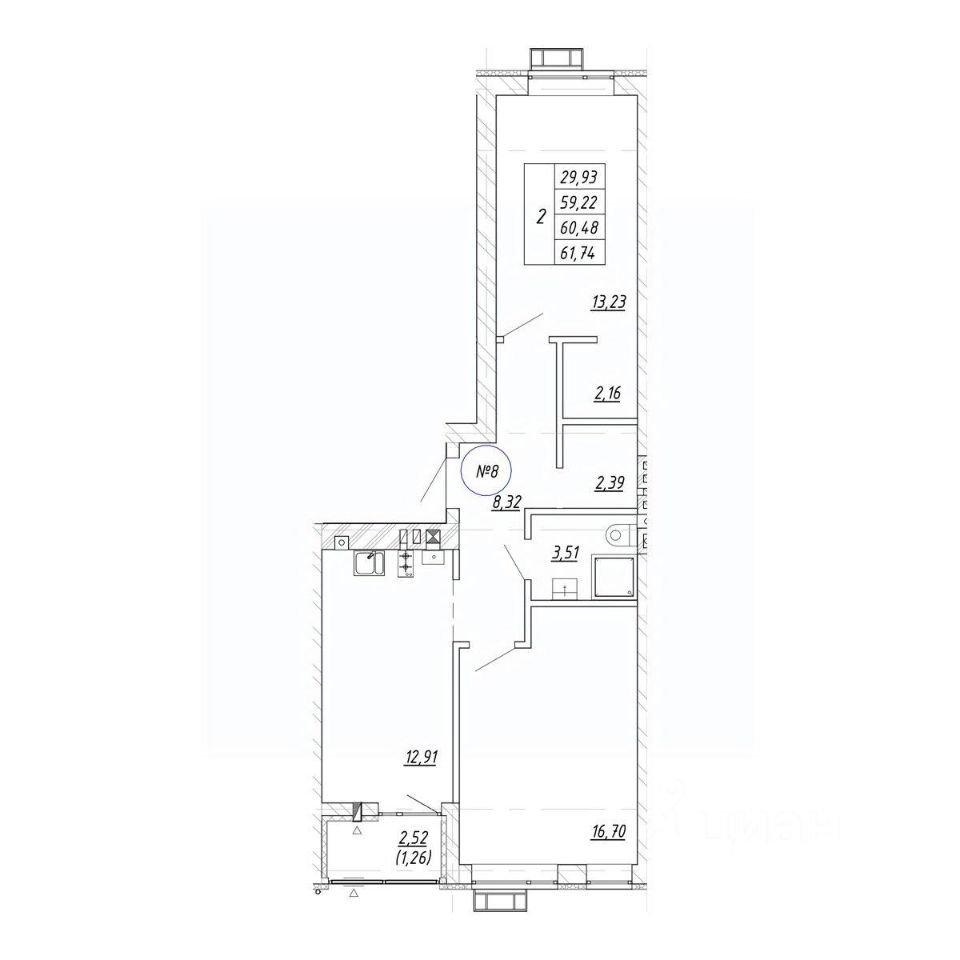 Продается 2-комн. квартира, 60,48 м²