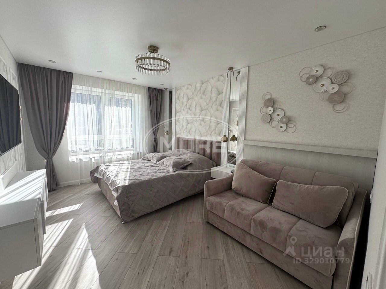 Современная кухня с большим окном и техникой, которая остается новому владельцу, большая и уютная спальня/гостиная, совмещённый санузел с ванной, теплые полы.