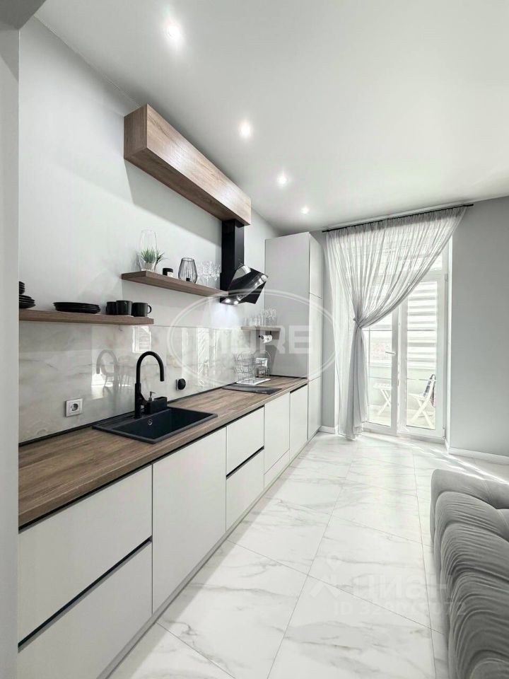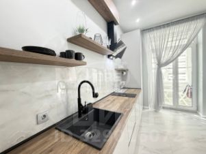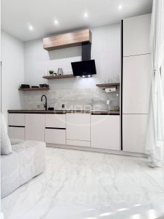 Встроенная кухня со стильными фасадами и столешницей под дерево, в наличии вся необходимая техника — индукционная варочная панель, вытяжка, микроволновая печь, электрический чайник, холодильник, стиральная машина.