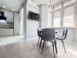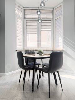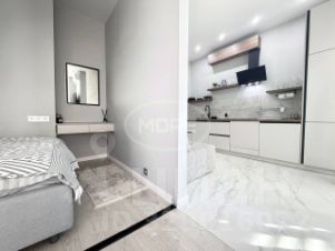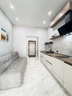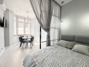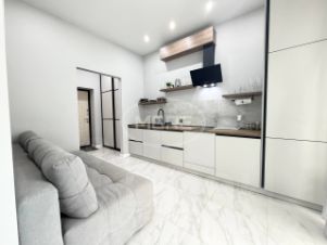 Площадь квартиры 35,2 квадратных метров, высокий 1-й этаж, высота потолков 3 метра, панорамные окна выходят во двор, квартира светлая и солнечная. В квартире есть всё — новая мебель и техника, текстиль и посуда, кондиционер, элегантные предметы интерьера.