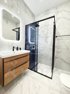 Просторный санузел с тропическим душем в современном исполнении за стеклянной перегородкой, инсталляция, зона хранения, подвесная раковина, зеркало с подсветкой.