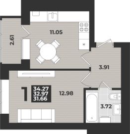 Продаётся 1-комнатная квартира в строящемся доме (Дом 3 (1 этап)), срок сдачи: II-кв. 2026, общей площадью 34.27 кв.м., на 2 этаже. Новый жилой комплекс "11 Мая" от застройщика "ГК Модуль-Стройград" расположен по адресу: г. Калининград, улица Согласия.