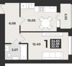 Продаётся 1-комнатная квартира в строящемся доме (Дом 3 (1 этап)), срок сдачи: II-кв. 2026, общей площадью 34.65 кв.м., на 9 этаже. Новый жилой комплекс "11 Мая" от застройщика "ГК Модуль-Стройград" расположен по адресу: г. Калининград, улица Согласия.