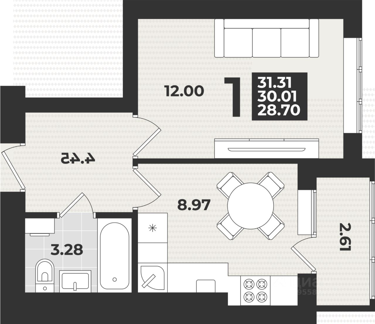 Продаётся 1-комнатная квартира в строящемся доме (Дом 3 (1 этап)), срок сдачи: II-кв. 2026, общей площадью 31.31 кв.м., на 6 этаже. Новый жилой комплекс "11 Мая" от застройщика "ГК Модуль-Стройград" расположен по адресу: г. Калининград, улица Согласия.