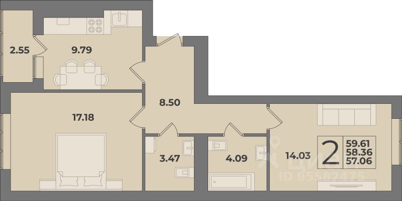 Продаётся 2-комнатная квартира в сданном доме (Дом 3 (1 этап)), срок сдачи: IV-кв. 2025, общей площадью 59.61 кв.м., на 2 этаже. Новый жилой комплекс "Суздальский-3" от Группы компаний "Модуль-Стройград" расположен в Ленинградском районе Калининграда на улице Суздальской.