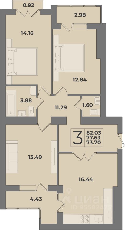 Продаётся 3-комнатная квартира в сданном доме (Дом 3 (1 этап)), срок сдачи: IV-кв. 2025, общей площадью 82.03 кв.м., на 9 этаже. Новый жилой комплекс "Суздальский-3" от Группы компаний "Модуль-Стройград" расположен в Ленинградском районе Калининграда на улице Суздальской.