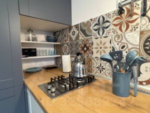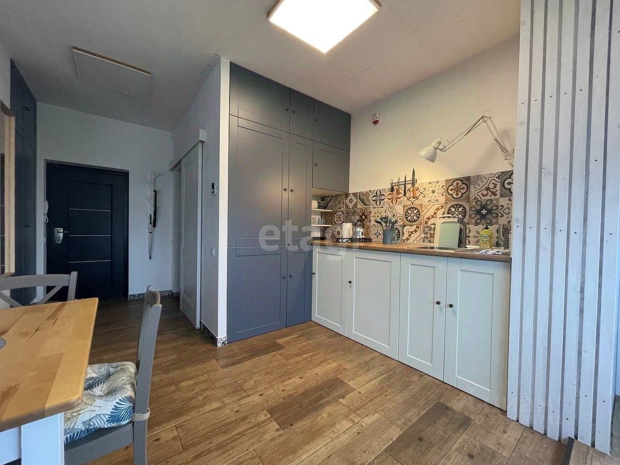 В квартире сделан интересный дизайнерский ремонт в светлых тонах с глубокими цветовыми акцентами!