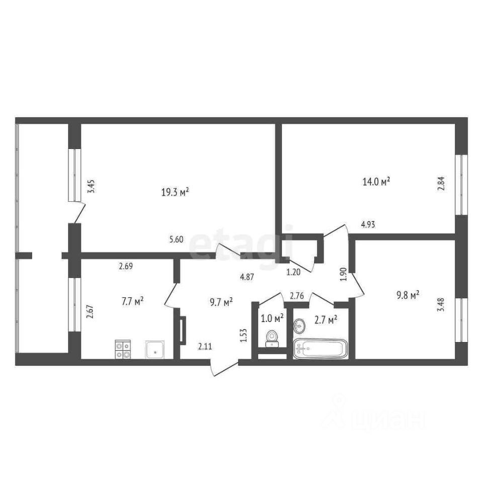 изолированные комнаты - 19.3 кв.м. + 14 кв.м. + 9.8 кв.м.
