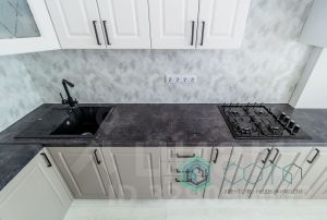 Площадь кухни -9,9 м2. Здесь расположен современный кухонный гарнитур, газовая плита, микроволновая печь, холодильник, вытяжка, обеденный стол со стульями.