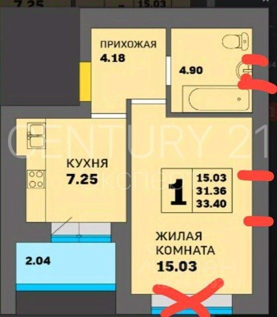 жилая комната — 15,03 м², кухня — 7,25 м², прихожая — 4,18 м², санузел — 4,90 м², лоджия — 2,04 м².