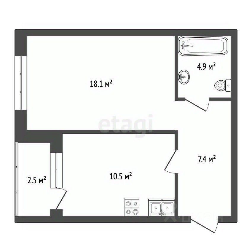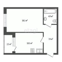 Удобная и функциональная планировка включает в себя просторную кухню 10,5 кв.м, уютную входную часть/коридор 7,4 кв.м, комфортный санузел 4,9 кв.м и балкон 2,5 кв.м.