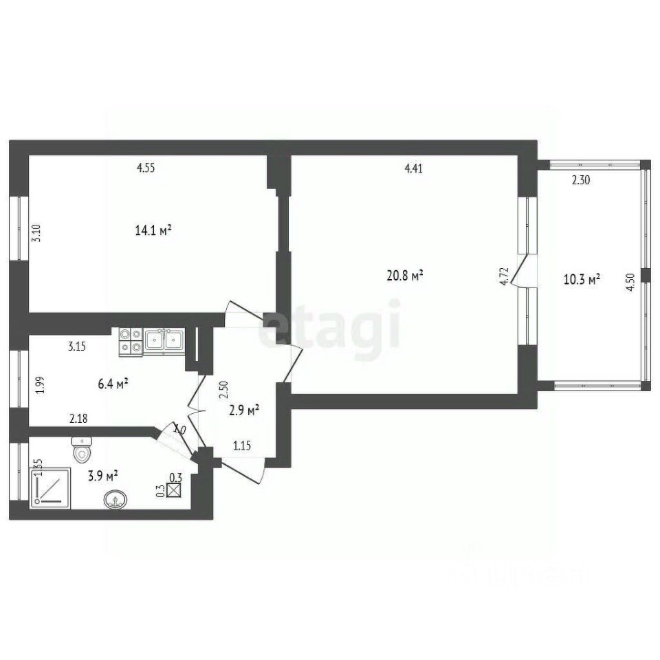 Комнаты: 20.8, 14.1 и 10.3 кв. м.