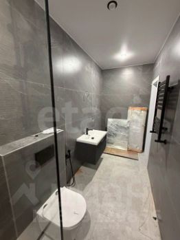 Санузел совмещен в кафеле, инсталляция , гардеробная для хранения, подвесная тумба с умывальником.