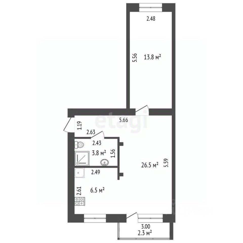 Увеличена кухня, соединенная с гостиной в формате студии, что создает ощущение простора. Совмещенный санузел.